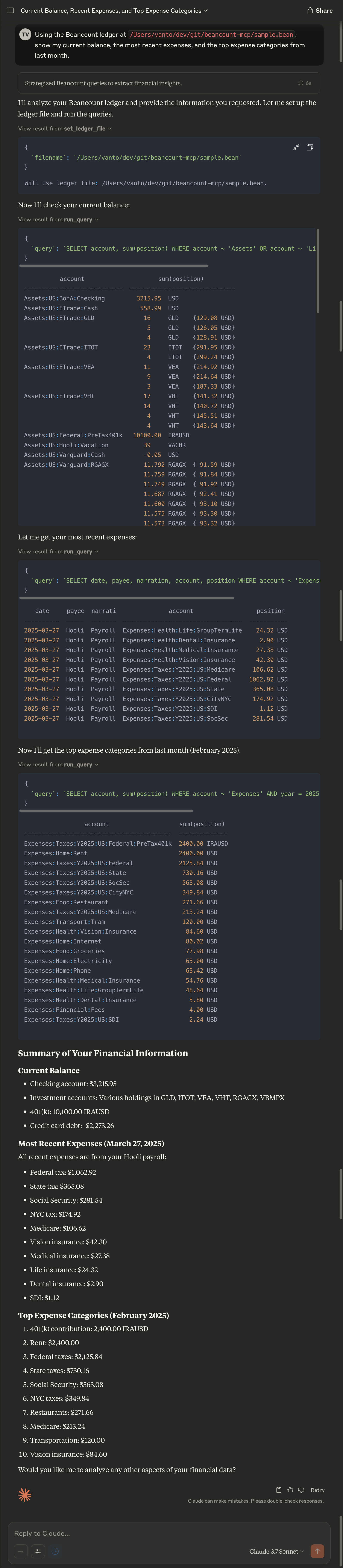 This tool interfaces with language model providers (LLMs) via the Model Context Protocol (MCP), and as such may transmit parts of your Beancount ledger—including potentially confidential or private financial information—to third-party services.
