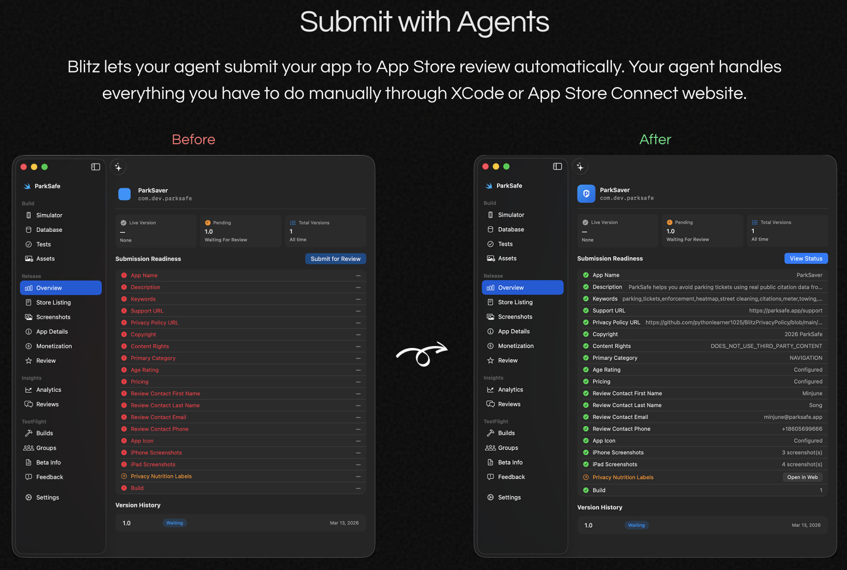 Blitz is a native macOS app that gives AI agents full control over the iOS development lifecycle — simulator/iPhone management, database setup, and App Store Connect submission. It includes built-in MCP servers so Claude Code (or any MCP client) can build, test, and submit your app to the App Store.