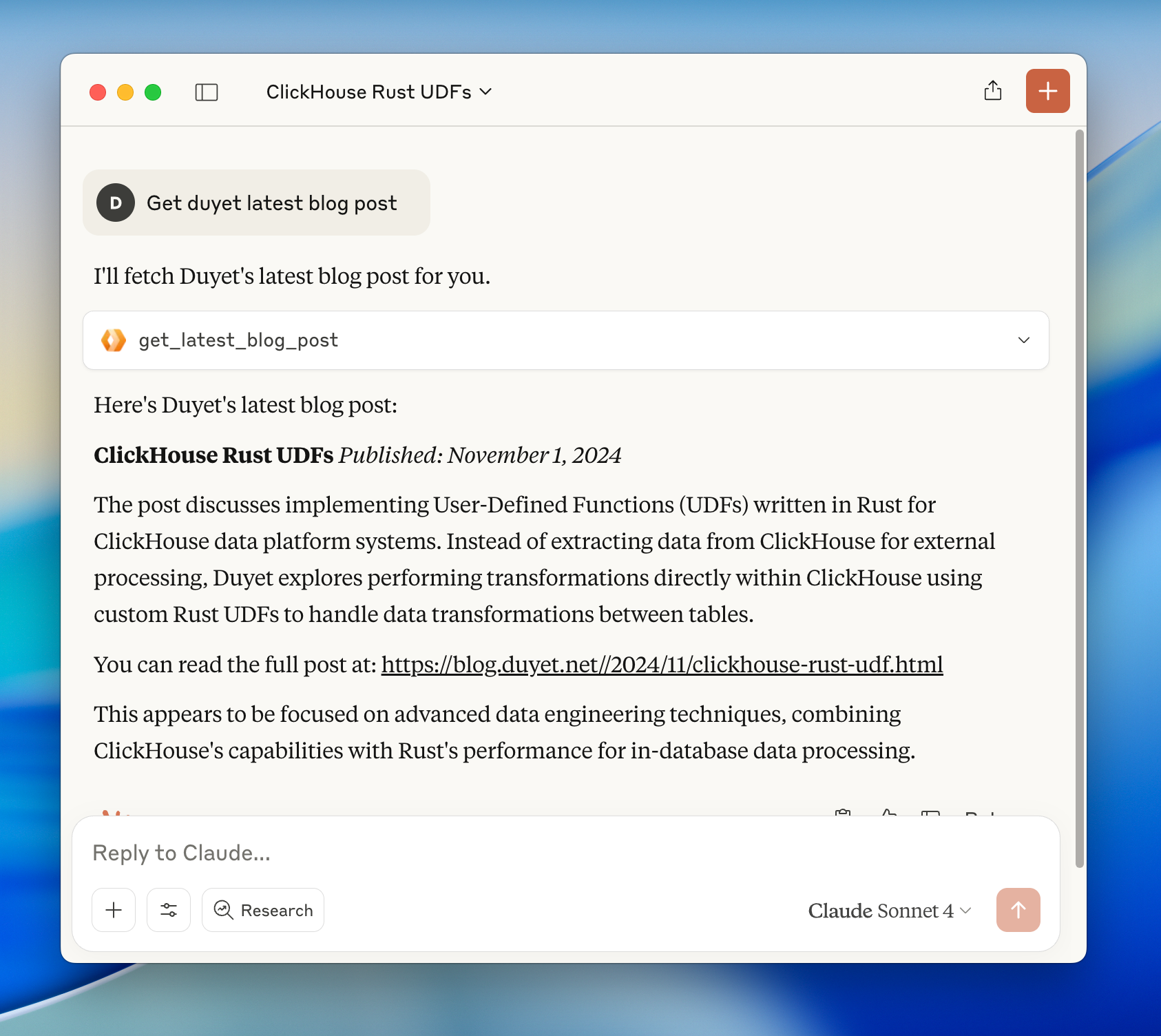 Claude: [Automatically accesses duyet://blog/posts/5 resource]
