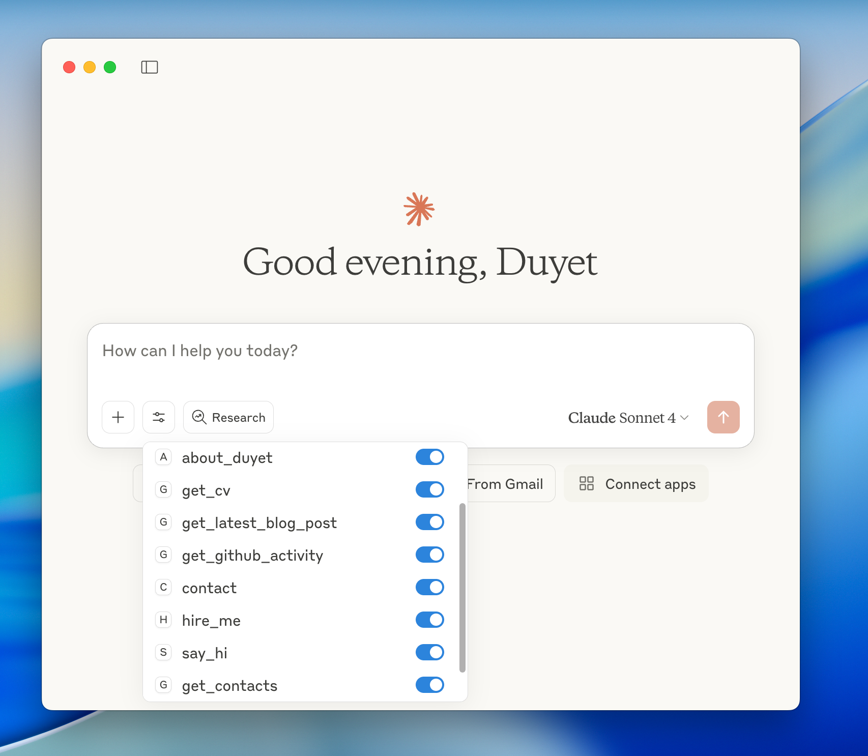 You should see the duyet-mcp information tools become available.