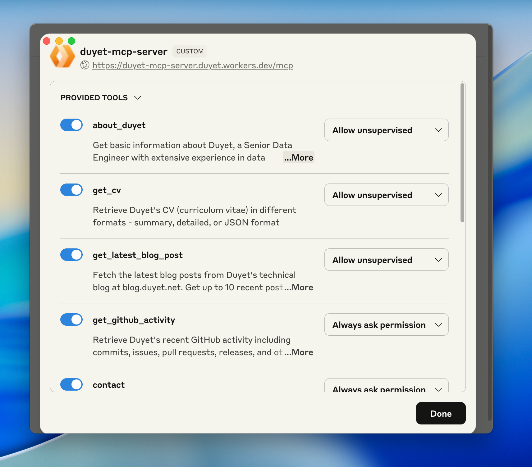 duyet-mcp-server.<your-account>.workers.dev/sseorduyet-mcp-server.<your-account>.workers.dev/mcp) - You can now use the duyet information tools directly from the playground!
