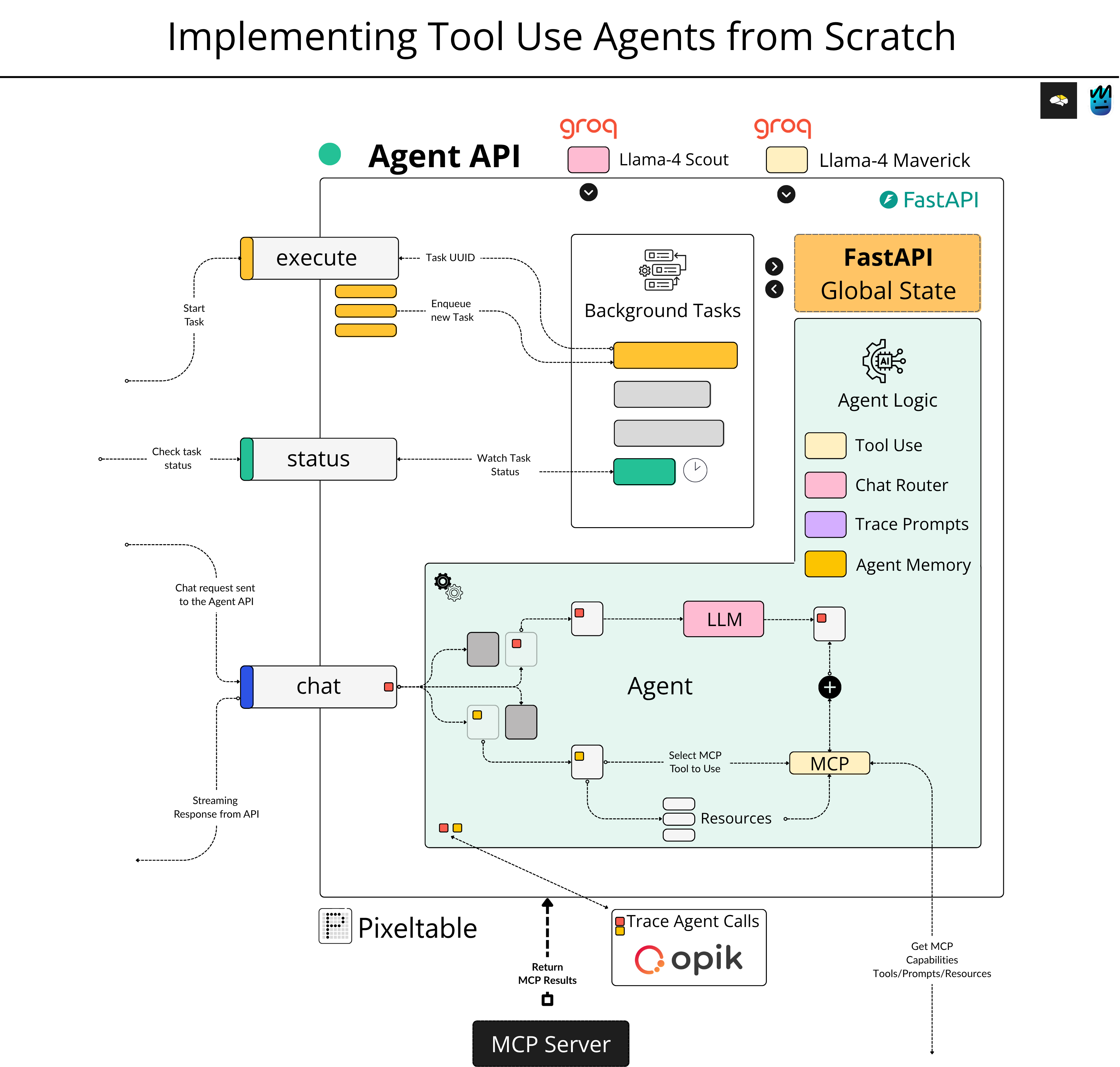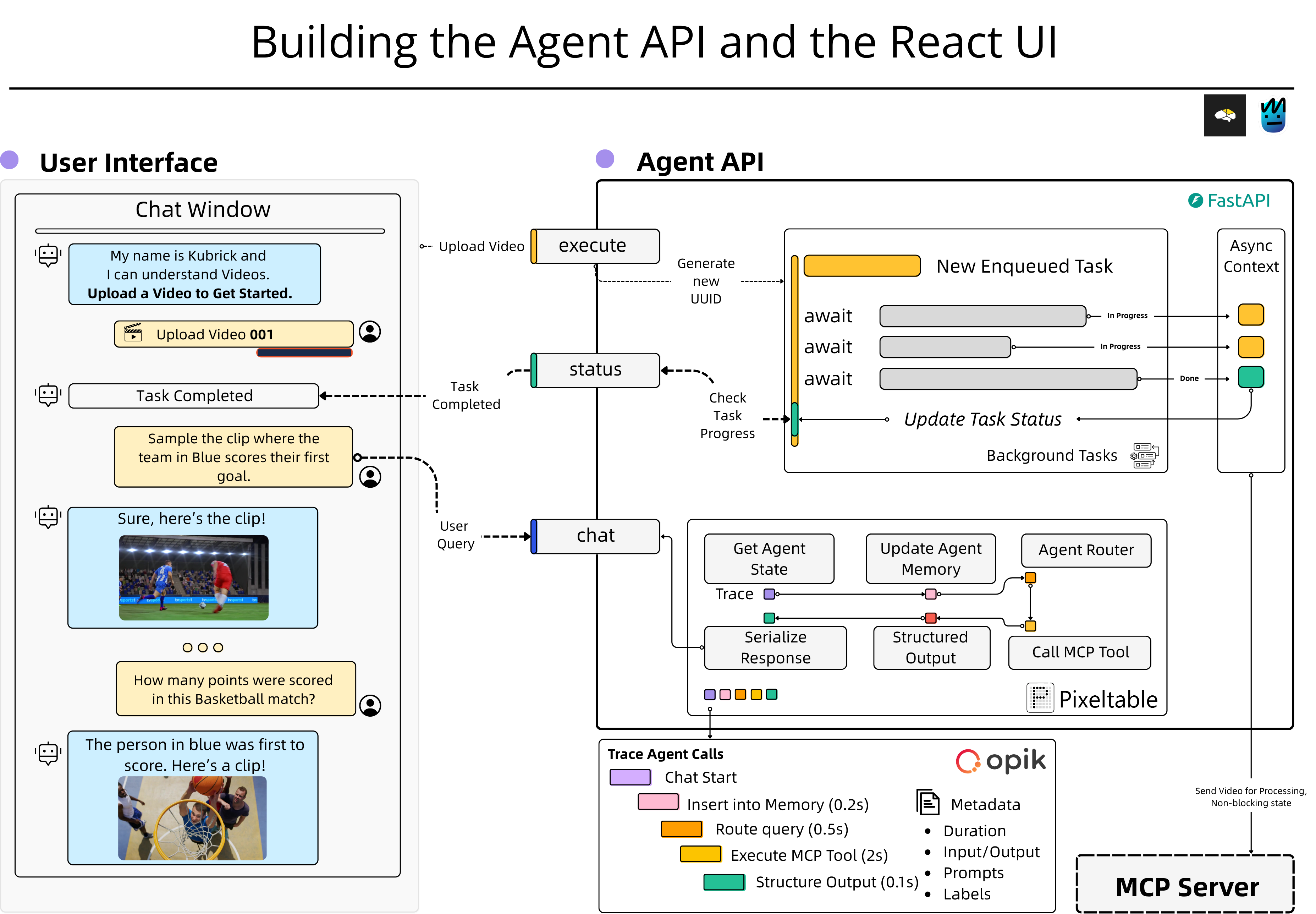 | 3 | ![]() | Get a Summary | Building the Kubrick MCP Agent from scratch. Memory layer implementation with Pixeltable and MCP Client with FastMCP. Understanding how to translate MCP Tools into specific provider tools (Groq) | kubrick-api |