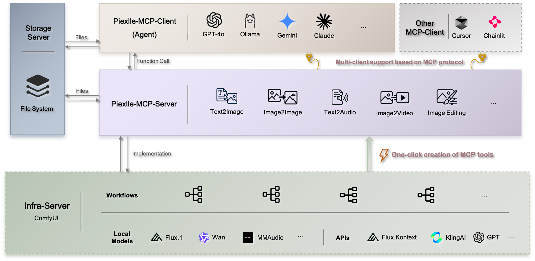 Pixelle MCP adopts a unified architecture design, integrating MCP server, web interface, and file services into one application, providing: