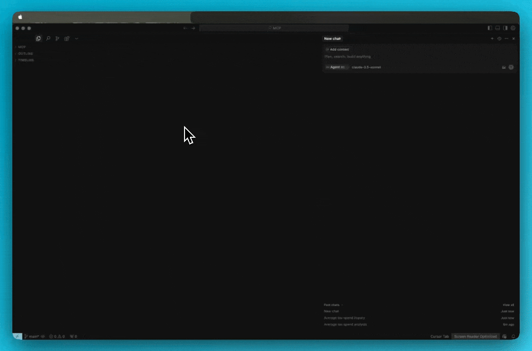 Register the MCP server in cursor by opening Cursor and navigating to Settings -> Cursor Settings -> MCP. Add the below.