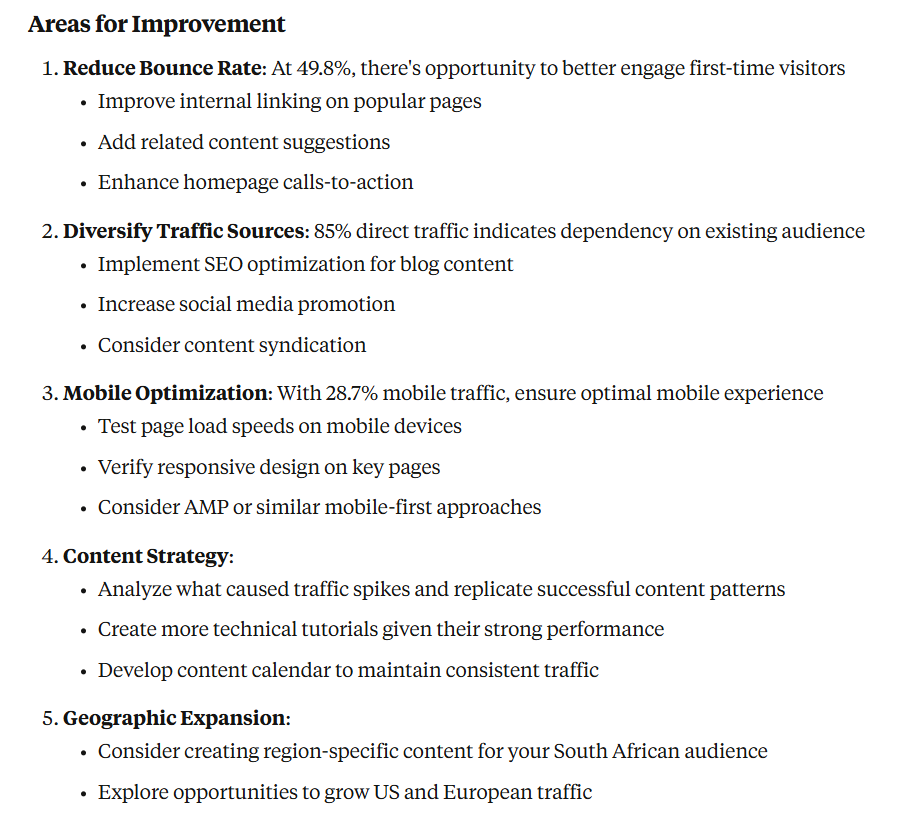 - "Give me a comprehensive analytics report for my website over the last 30 days"